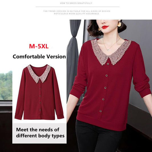 T-shirt à manches longues et col poupée en dentelle pour femmes