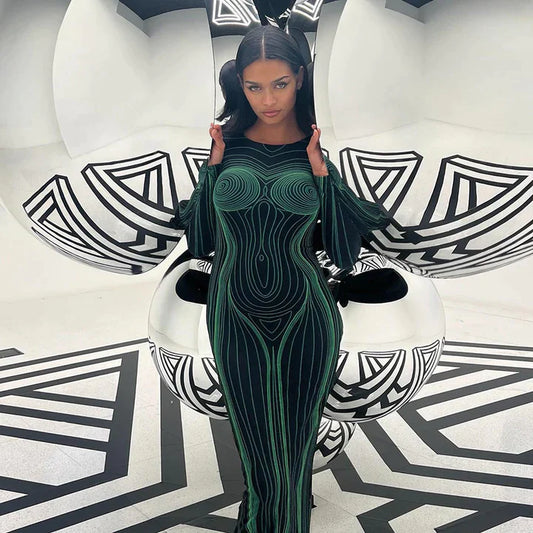 Maci | PRINT MESH MAXI JURKEN MET LANGE MOUWEN