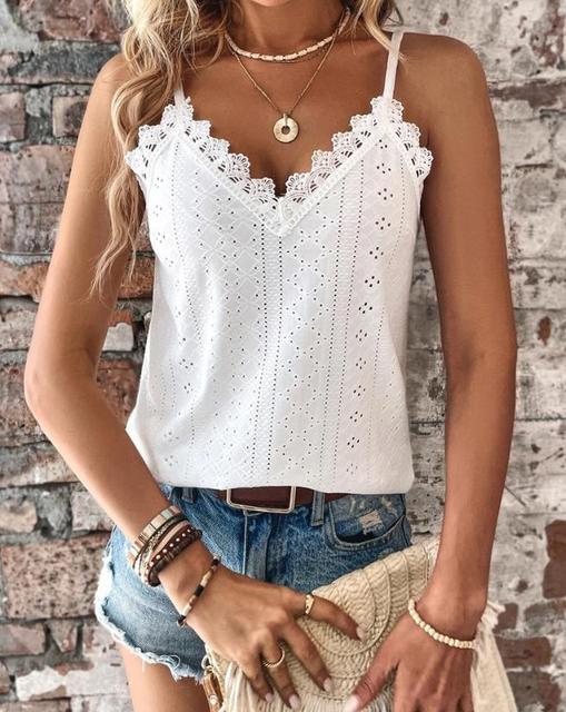 Tauchen Sie ein in den unwiderstehlichen Charme des Sommers mit unserem Spitzentop mit V-Ausschnitt CRIPES. Die kunstvolle Ösenstickerei und die zarten Spitzenpatches unterstreichen Ihre Weiblichkeit auf subtile und stilvolle Weise.