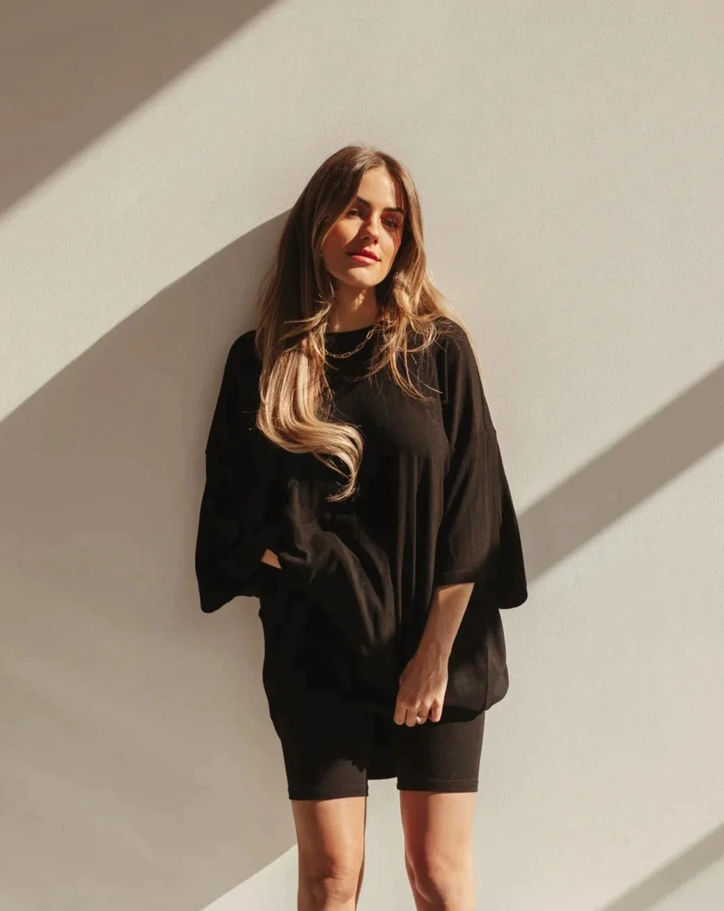 ✓ Moeiteloos comfort: Ervaar de perfecte balans van knusheid en vrijheid in deze combinatie van een oversized T-shirt en een bikershort.