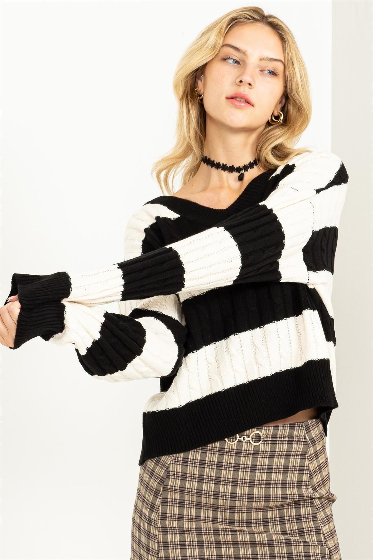 Verfraai je wintergarderobe met onze zwart-wit gestreepte gebreide kabel trui. Dit meesterwerk van 100% polyester heeft een v-hals, druppelschouder en lange mouwen en is een knusse mix van chic design en luxe comfort.