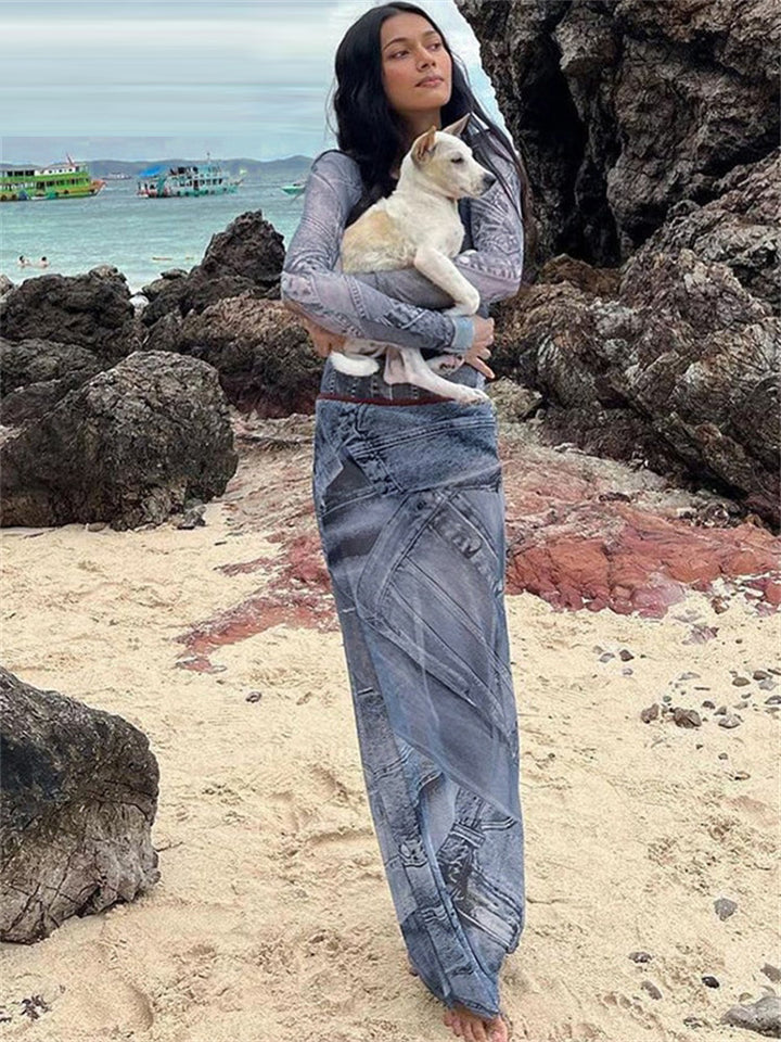 Maci | PRINT MESH MAXI JURKEN MET LANGE MOUWEN