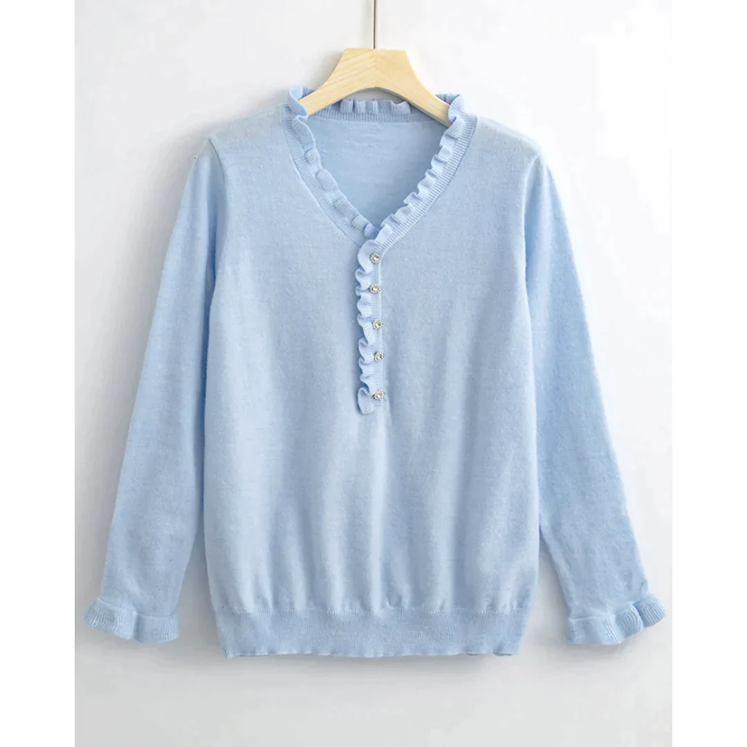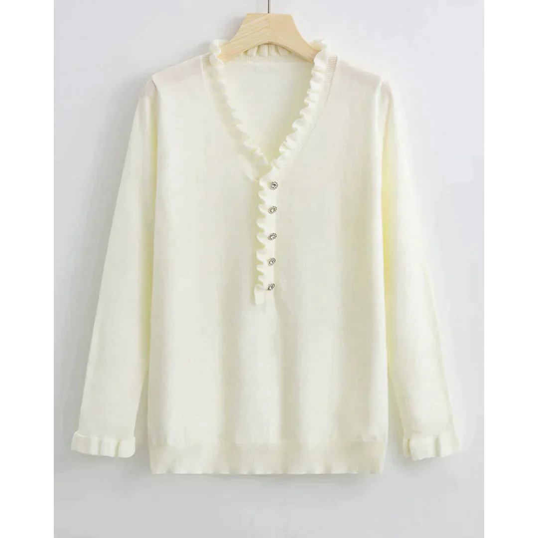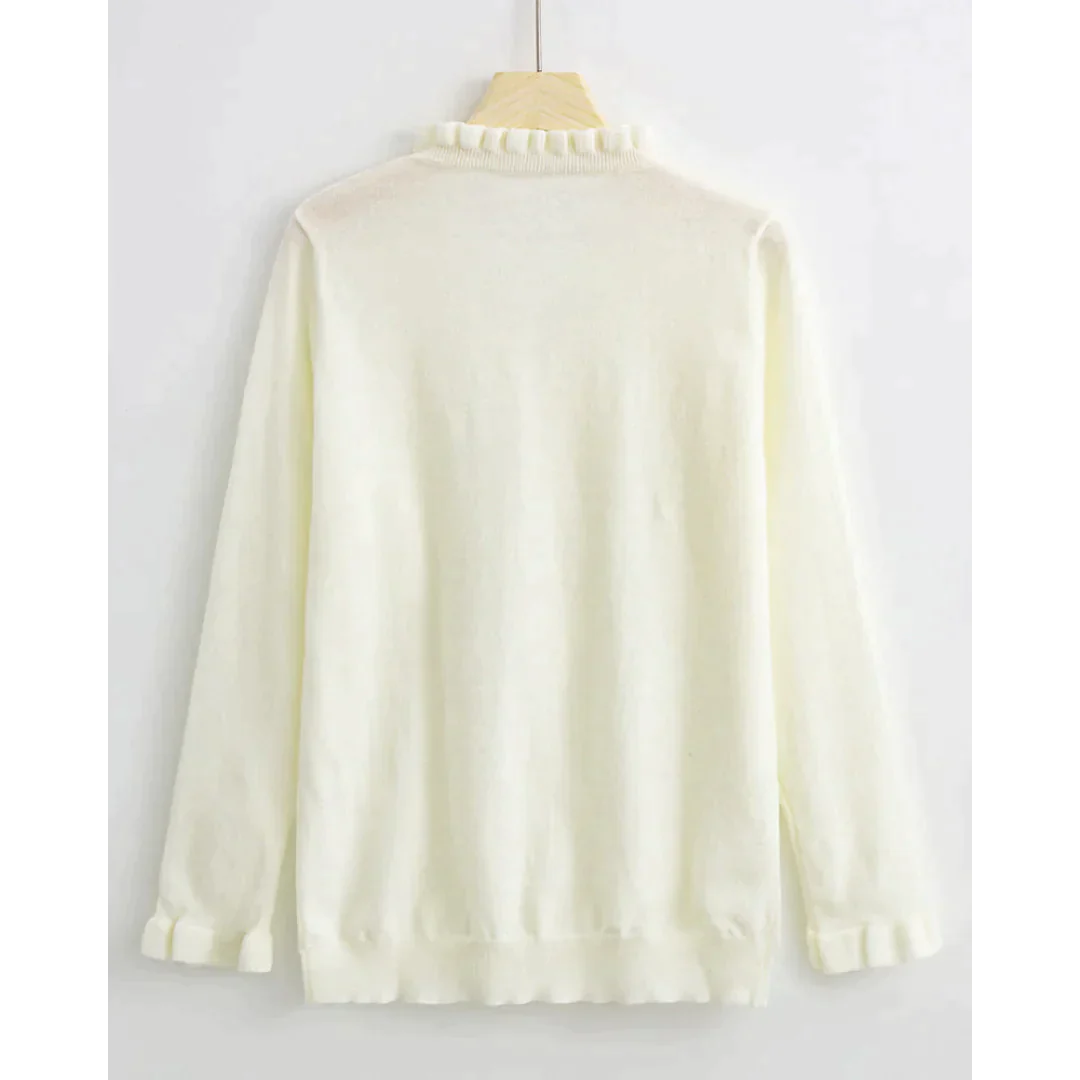 Geniet van chique elegantie met onze trui versierd met knopen – een tijdloos stuk dat verfijning moeiteloos combineert met comfort. De knoopdetails voegen een vleugje verfijning toe aan het klassieke truiontwerp, waardoor een ensemble ontstaat dat zowel stijlvol als veelzijdig is.